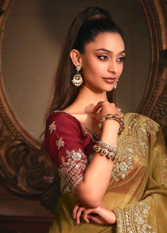 Olive Green Satin Chiffon Saree with Zari Lace Detailing