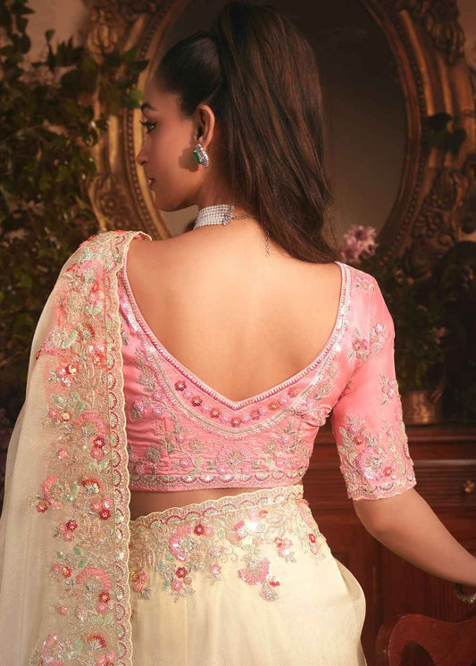 Pastel Pink Satin Chiffon Saree with Designer Embroidery