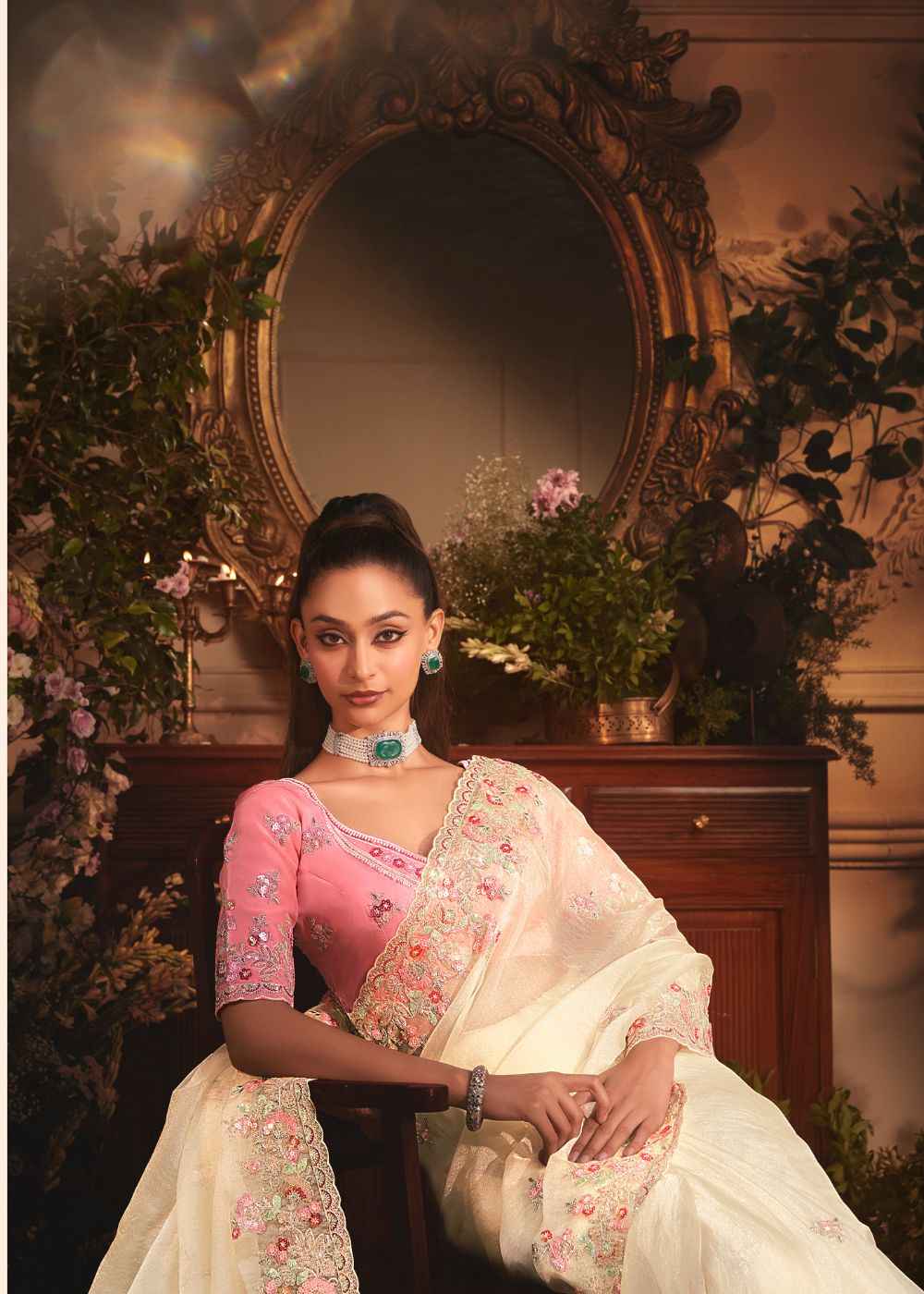 Delicate ivory tissue organza with subtle pink floral embroidery and a beautifully crafted designer border, paired with a soft silk blouse.
