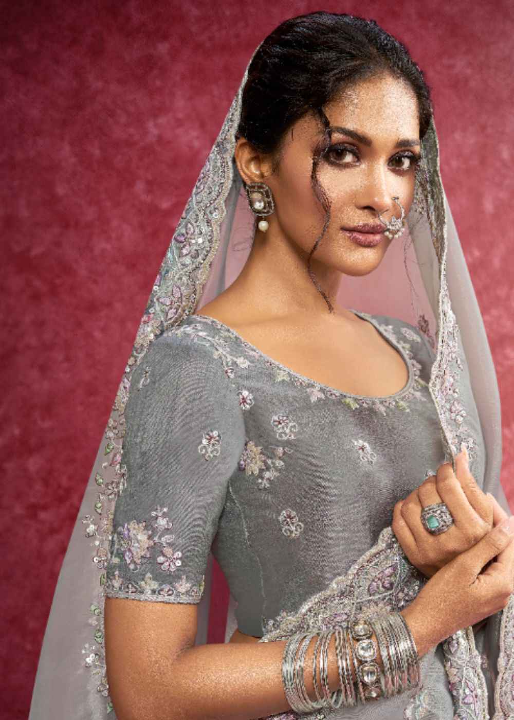 This grey saree in Siya Silk drapes like charm, offering a modern and chic look with elegant embroidery—perfect for classy evening wear.